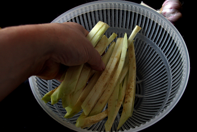 Al cabo de aproximadamente 24 horas, colocarlas en un colador y lavarlas varias veces debajo del grifo para extraer gran parte de la sal y el líquido amargo que ellas sudaron.
