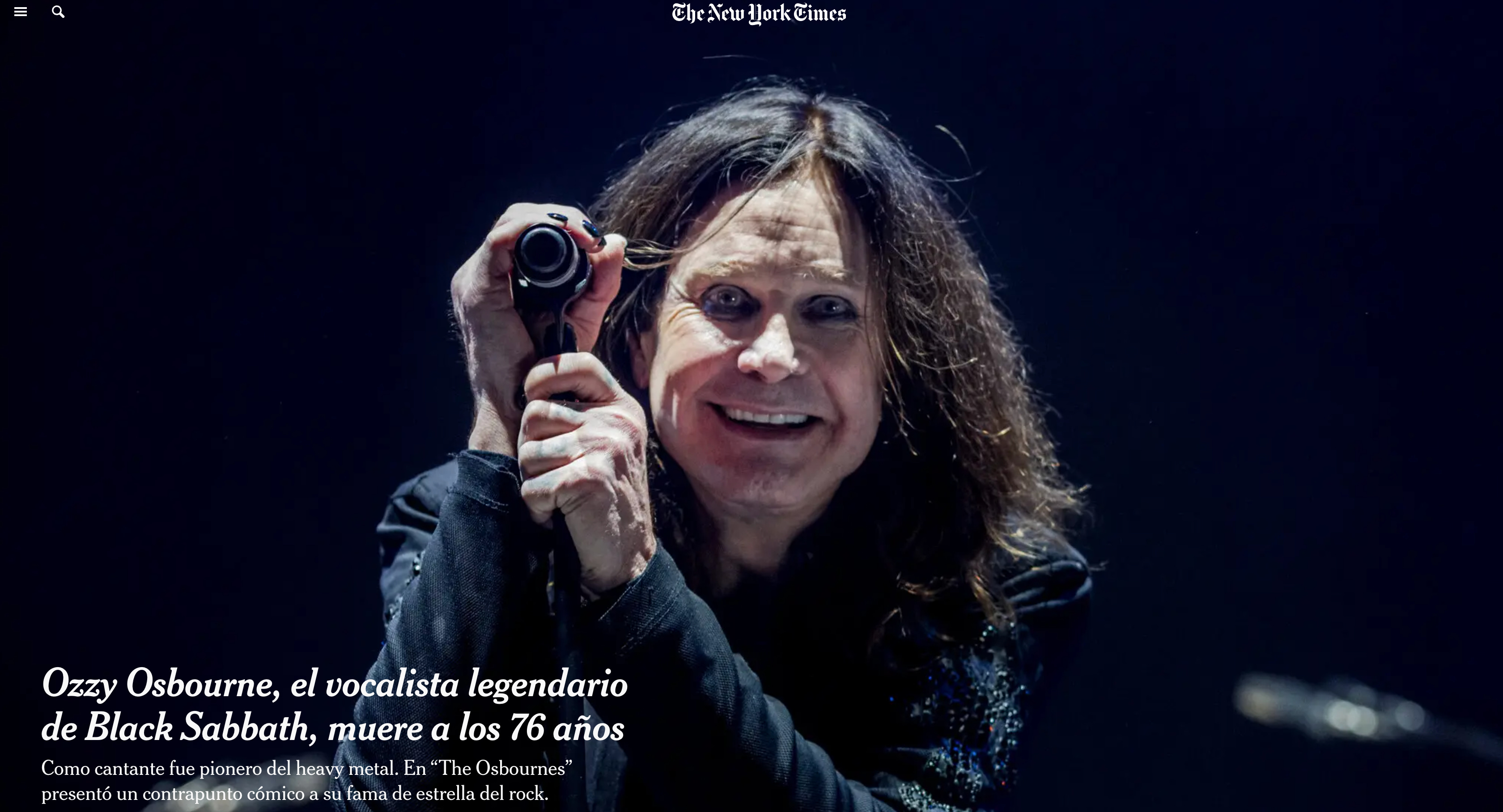 -The New York Times: Ozzy Osbourne, el vocalista legendario de Black Sabbath, muere a los 76 años.