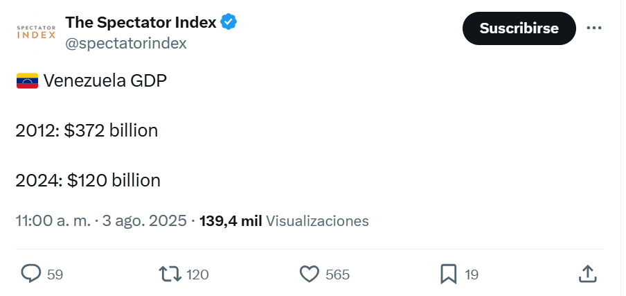 En dos platos: en 2012 la suma de todo lo producido en Venezuela era de 372 mil millones de dólares y para 2024 se redujo a la tercera parte, a 120 mil millones.