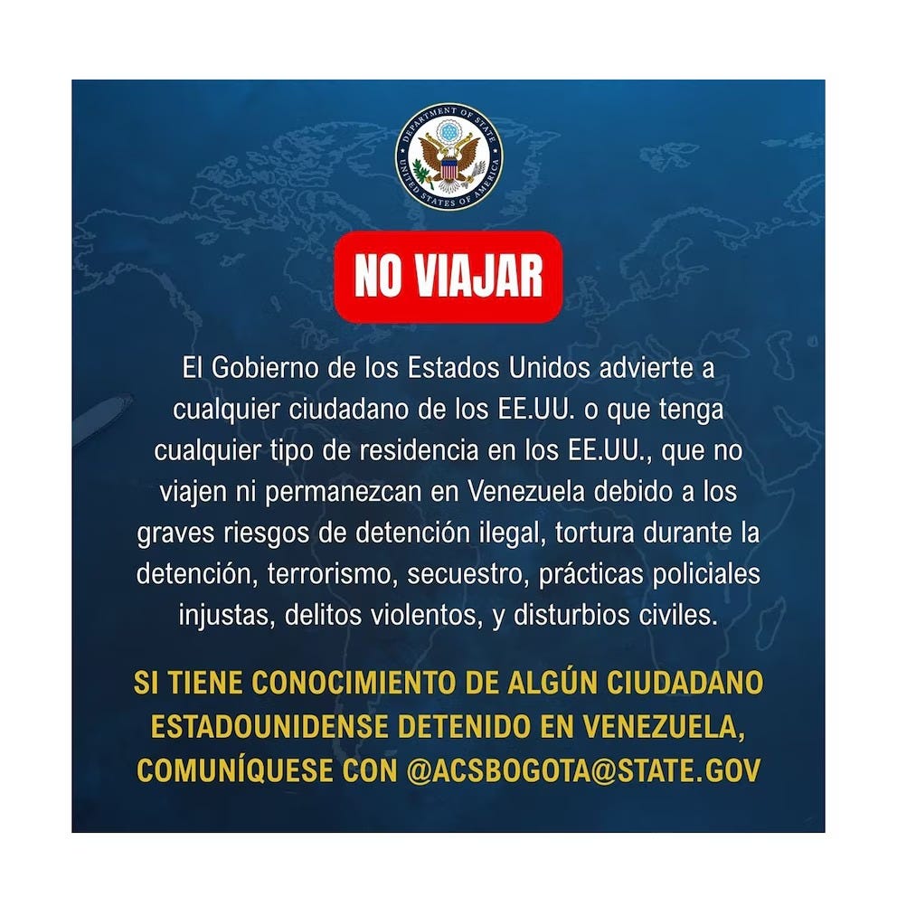 -EFE/Infobae: Estados Unidos emitió una alerta máxima y pidió a sus ciudadanos no viajar a Venezuela en medio de las crecientes tensiones.