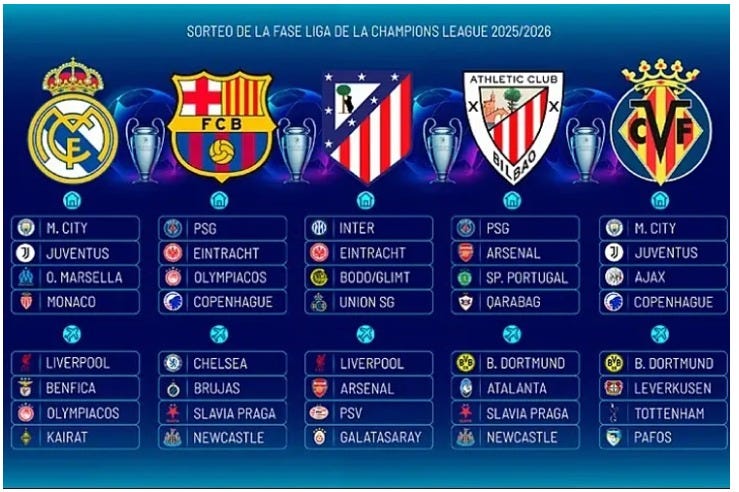 -El Mundo: Champions League. El sorteo de la Champions le ‘regala’ al Madrid un viaje de 8.000 km y duelos contra Liverpool y City; ruta plácida para el Barça e incómoda para el Atlético.