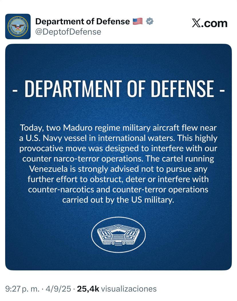 -El Nacional: “Acción altamente provocadora”: el Pentágono denuncia que dos aviones de Venezuela sobrevolaron un buque de la Marina de EE UU en aguas internacionales.