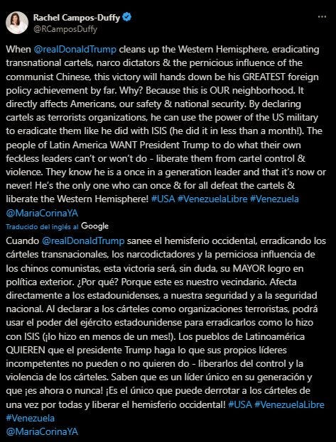 - El presidente de Estados Unidos, Donald Trump, reafirmó este jueves su enfoque en Venezuela y el hemisferio occidental al destacar el mensaje de la periodista Rachel Campos-Duffy, quien asegura que los pueblos latinoamericanos quieren que él los “libere” del yugo de los cárteles del narcotráfico y que su Administración debe “limpiar” la región.