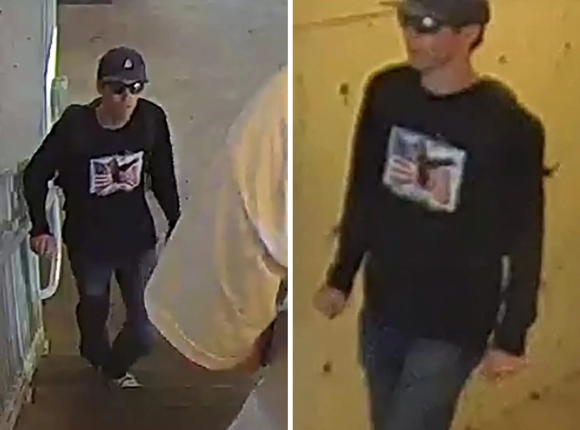- Las imágenes muestran a un hombre con una gorra de béisbol, gafas de sol oscuras y una camiseta negra de manga larga con una imagen que parece incluir, en parte, un dibujo de la bandera estadounidense.