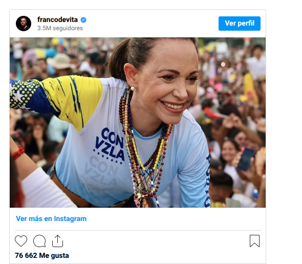 - El cantante Franco de Vita también dedicó un breve y sentido mensaje a María Corina Machado en su cuenta de Instagram: “Qué gran ejemplo le has dado al mundo entero. Los venezolanos no podemos sentirnos más orgullosos de ti, @mariacorinamachado Eres lo más grande que ha parido ese país”.