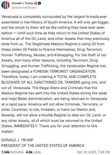 - “Venezuela está completamente rodeada por la mayor Armada jamás reunida en la historia de Sudamérica. Solo se hará más grande, y el impacto para ellos será como nada que hayan visto antes — hasta que devuelvan a Estados Unidos todo el petróleo, la tierra y otros activos que previamente nos robaron”, dijo Trump el martes por la noche.