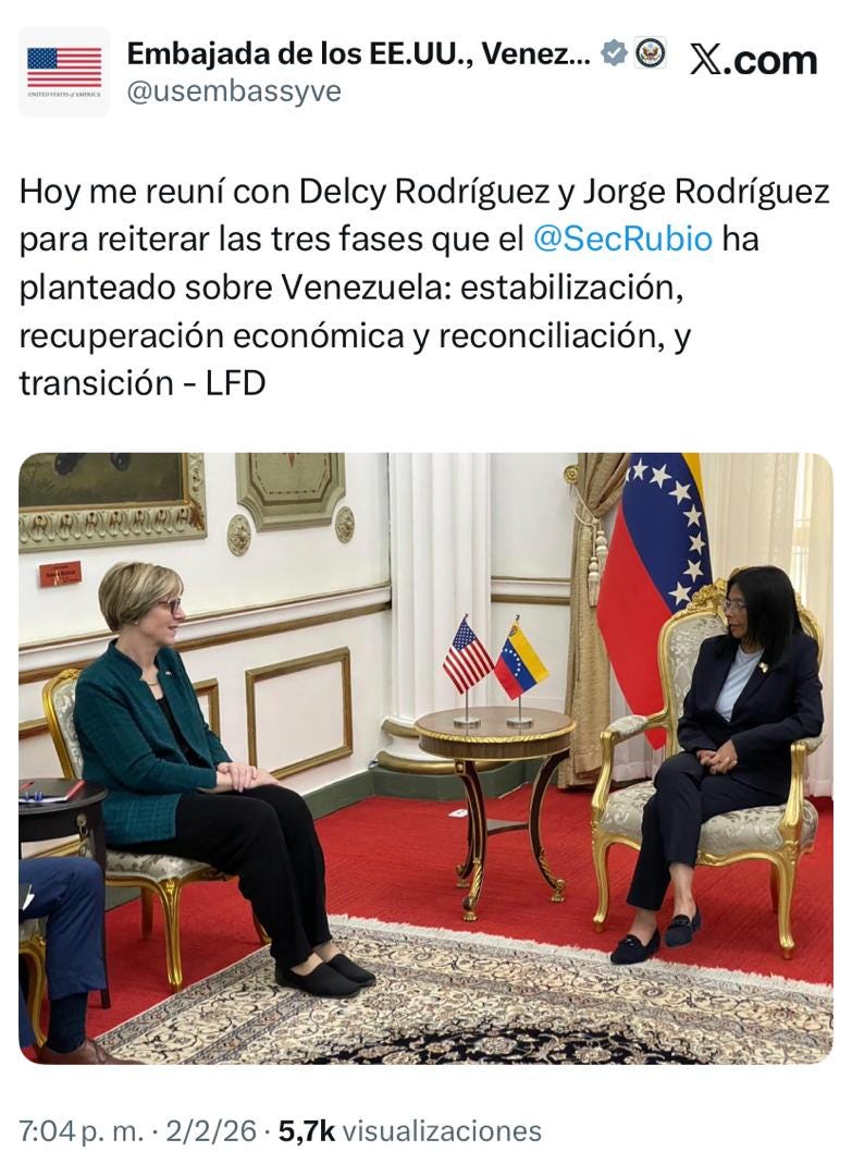 -Ministro de Comunicación de Venezuela, Pérez Pirela, X: Este lunes 2 de febrero en horas de la tarde la presidenta (E) de Venezuela, Delcy Rodríguez, se ha reunido con la Encargada de Negocios de los Estados Unidos de América de la Unidad de Asuntos para Venezuela, Laura Dogu.