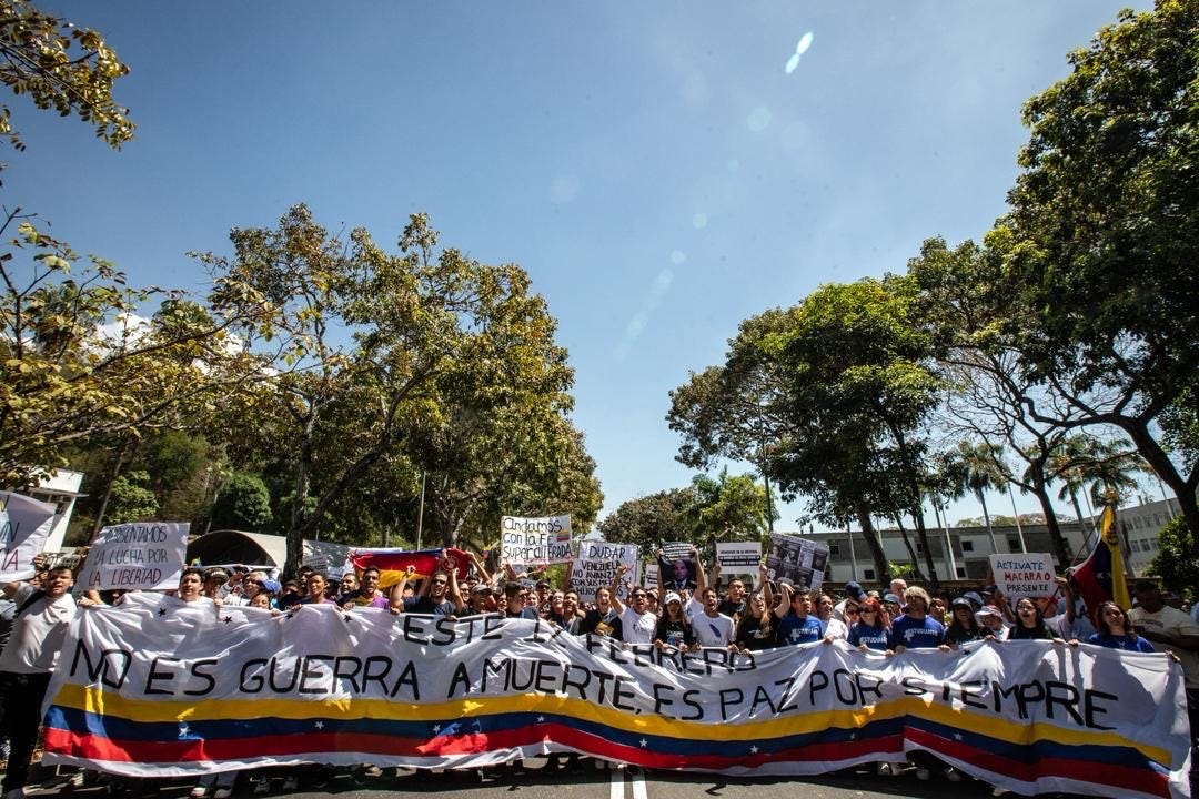 - Monitoreamos: Estudiantes lograron salir de la UCV y marchar en Caracas en un histórico Día de la Juventud. «No es guerra a muerte, es paz por siempre»: el mensaje del movimiento estudiantil de la UCV este 12-F.