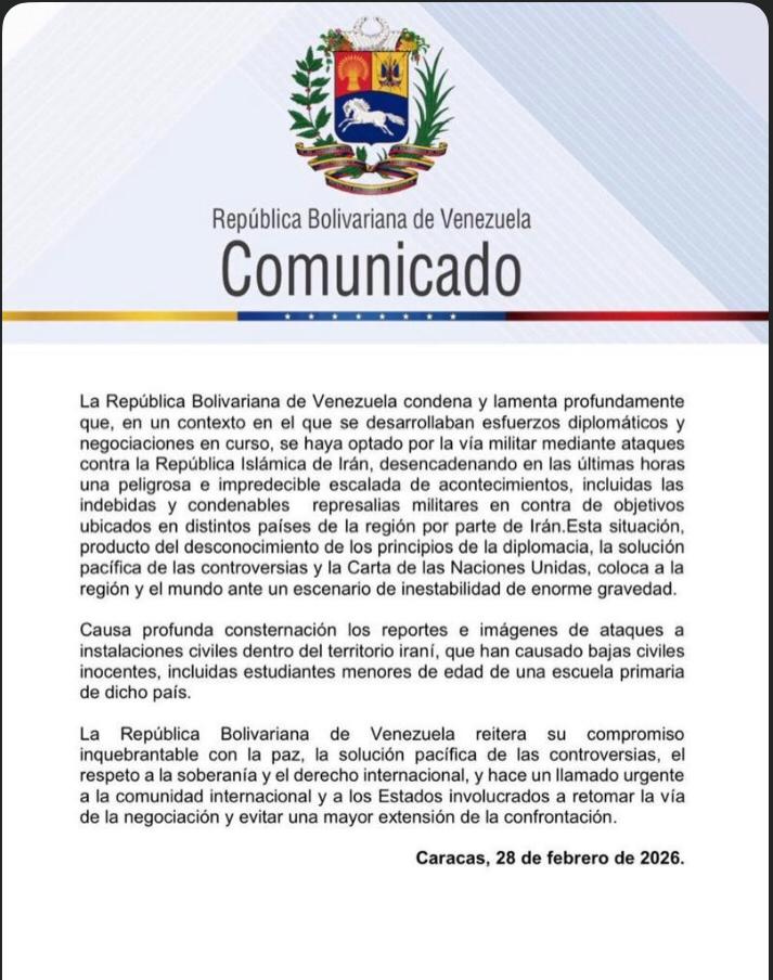 - En un comunicado, Venezuela señaló que los ataques contra Irán –sin mención expresa de Estados Unidos o Israel– han desencadenado una «peligrosa e impredecible escalada de acontecimientos, incluidas las indebidas y condenables represalias militares en contra de objetivos ubicados en distintos países de la región por parte de Irán».