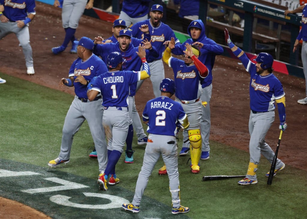 - Ronald Acuña Jr., Maikel García y Luis Arráez conectaron sencillos productores de carrera con dos outs en un rally en la séptima entrada que llevó a Venezuela a vencer 4-2 a Italia el lunes por la noche y a avanzar a su primer juego de campeonato del Clásico Mundial de Béisbol.