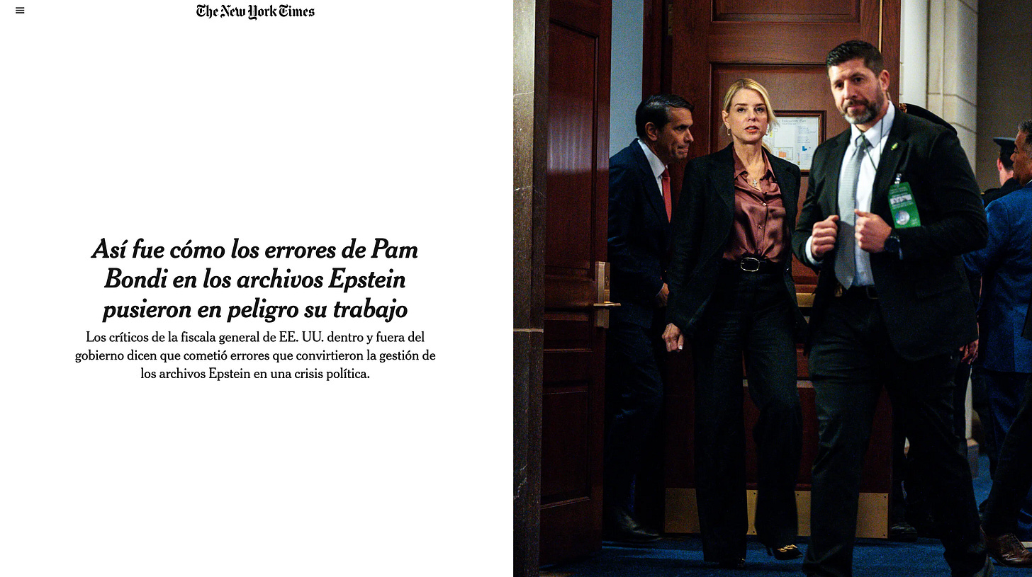 -The New York Times: Así fue cómo los errores de Pam Bondi en los archivos Epstein pusieron en peligro su trabajo.