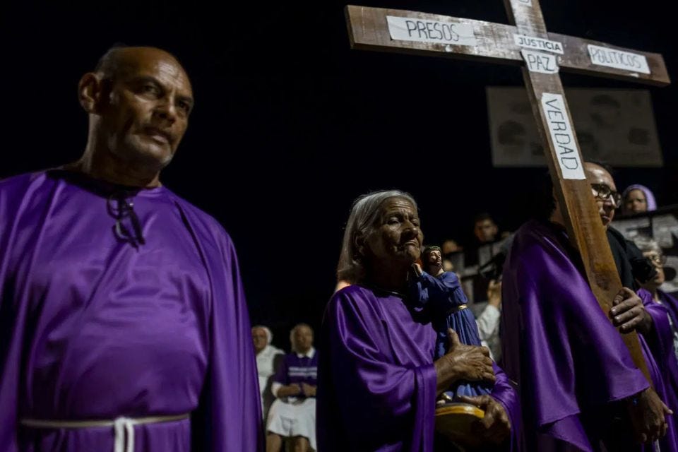 - Con velas y algunos vistiendo túnicas moradas, familiares de presos políticos y activistas de realizaron la noche de este miércoles un viacrucis en las afueras de la cárcel El Rodeo I, ubicada en el estado Miranda.